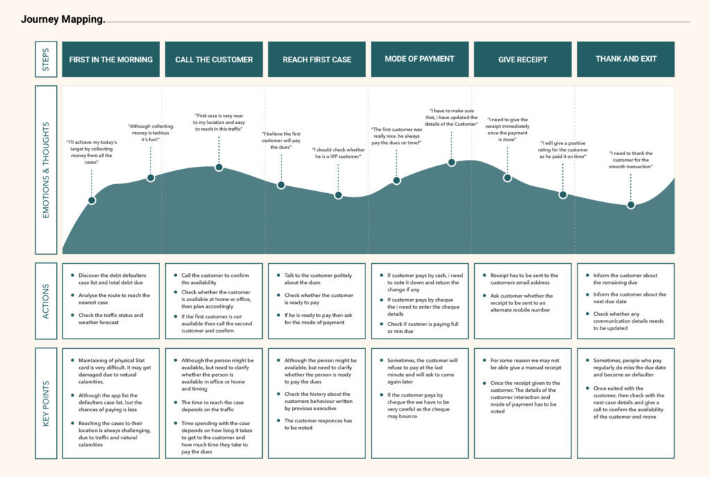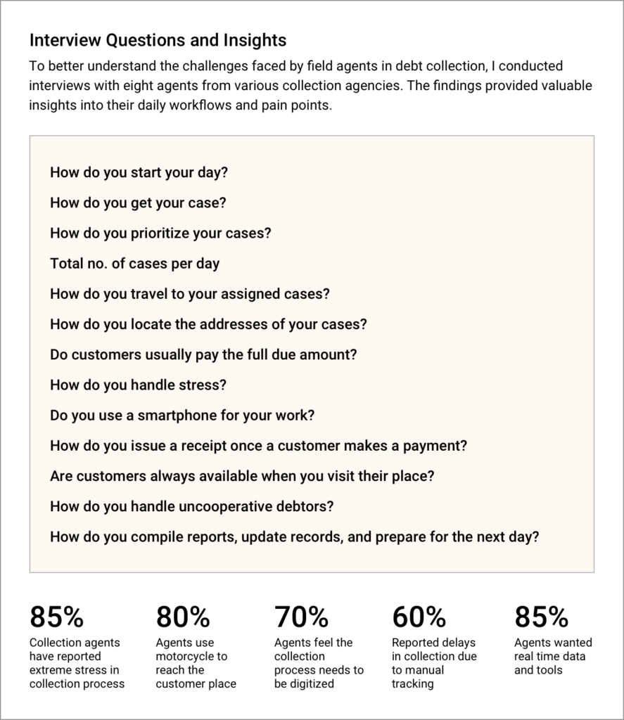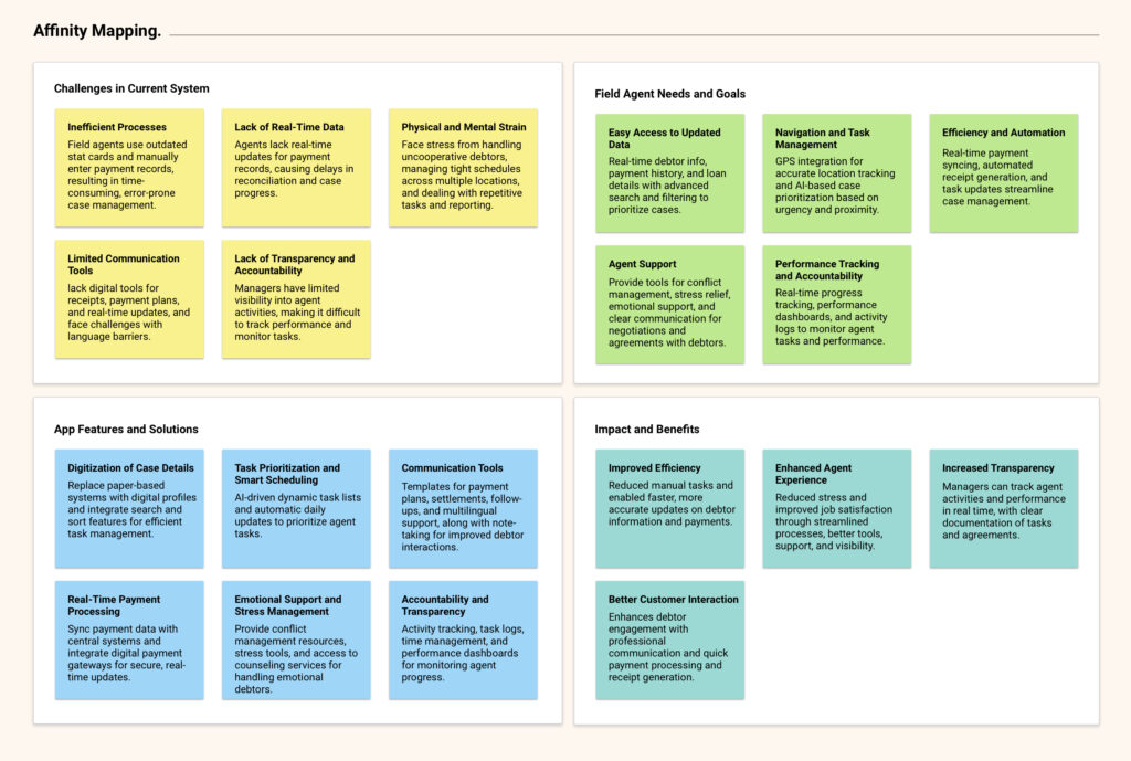 Affinity mapping was used to organize feedback from field agents into actionable themes, highlighting key challenges and opportunities for innovation. This, combined with a user journey map that outlines their tasks, pain points, and workflows, helped identify areas to improve efficiency in the debt collection process.