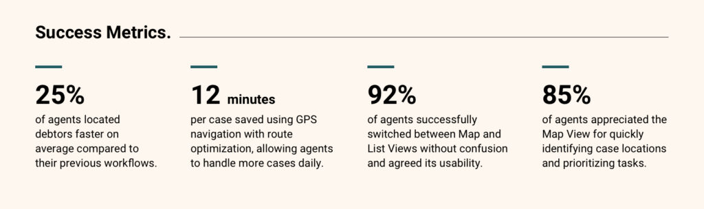 - Improved Efficiency: 25% faster debtor location; GPS optimization saved 12 minutes per case.